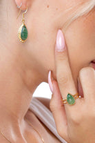 Each earring is set with a natural Aventurine stone in a soft green hue, symbolizing calm, healing, and renewed growth.