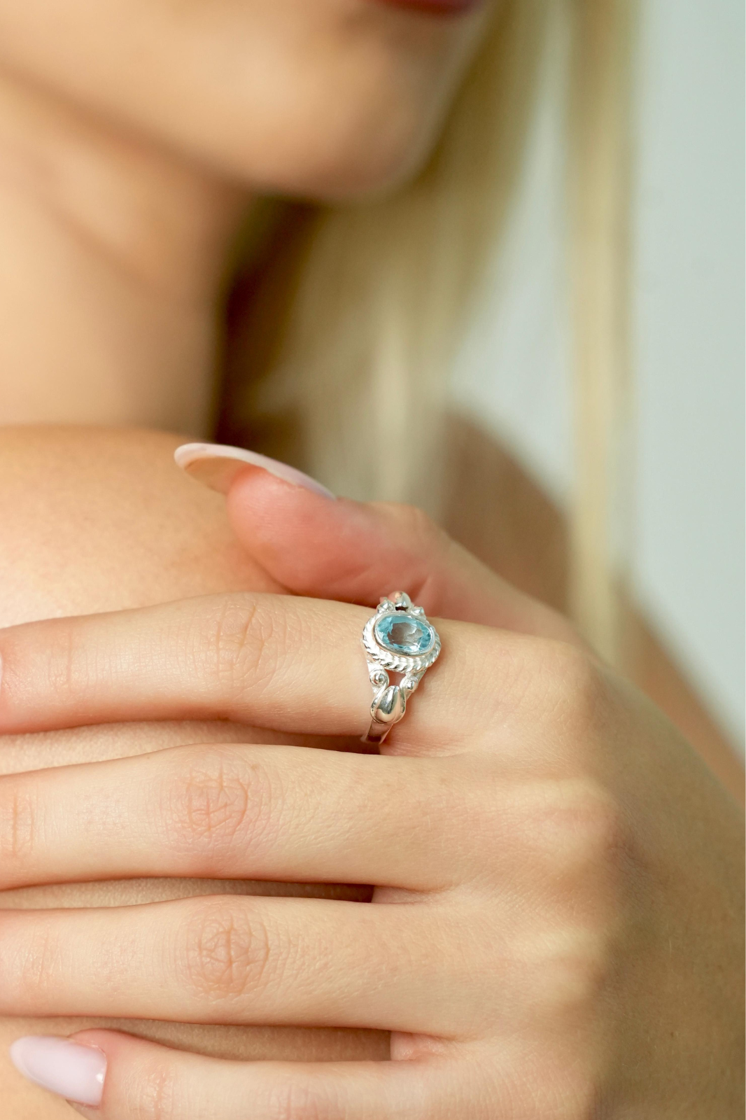 The Blue Topaz’s luminous sky-blue tones reflect light beautifully, giving the piece a fresh, refined, and timeless feel.